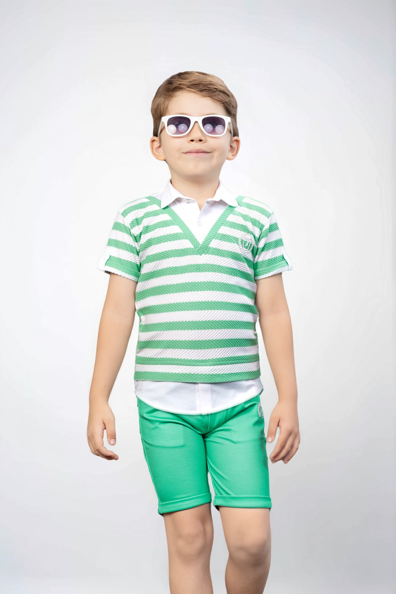 Refresh your little one’s wardrobe with this trendy Arieh Boys’ Green Striped T-Shirt & Shorts Set. Designed for style and comfort, the set features a soft green-and-white striped T-shirt layered with a white polo collar insert for a smart-casual look, paired with matching green shorts for all-day comfort. Perfect for casual outings, playdates, and summer wear.
