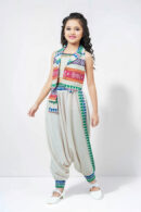 Add a touch of ethnic elegance with a modern twist to your little one’s wardrobe with this Bows & Ribbons Cream Dhoti Outfit. Designed with a sleeveless multicolor printed jacket, crop top, and stylish dhoti pants, this set is perfect for festive occasions, parties, and cultural celebrations. The vibrant prints and comfortable fit make it a perfect blend of tradition and trend for young girls.
