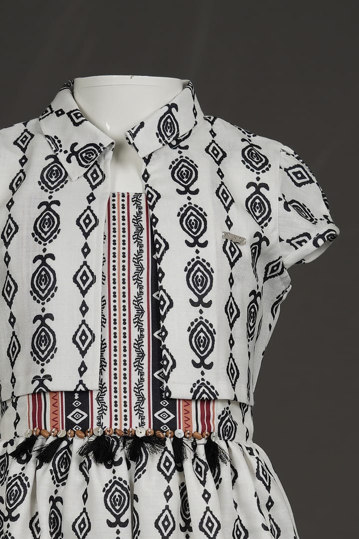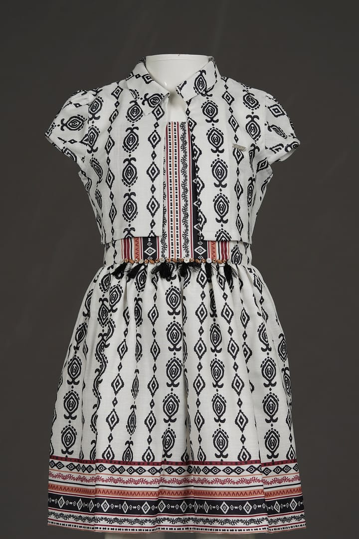 Celebrate tradition with a twist in this beautifully crafted black and white tribal print dress by Tiny Baby. The dress features an all-over ethnic-inspired pattern, short sleeves, and a button-down front placket with subtle contrast detailing. Finished with a cinched waist for a flattering fit and a decorative hemline border, this dress is perfect for cultural events, casual outings, or any day your little one wants to stand out with effortless charm.