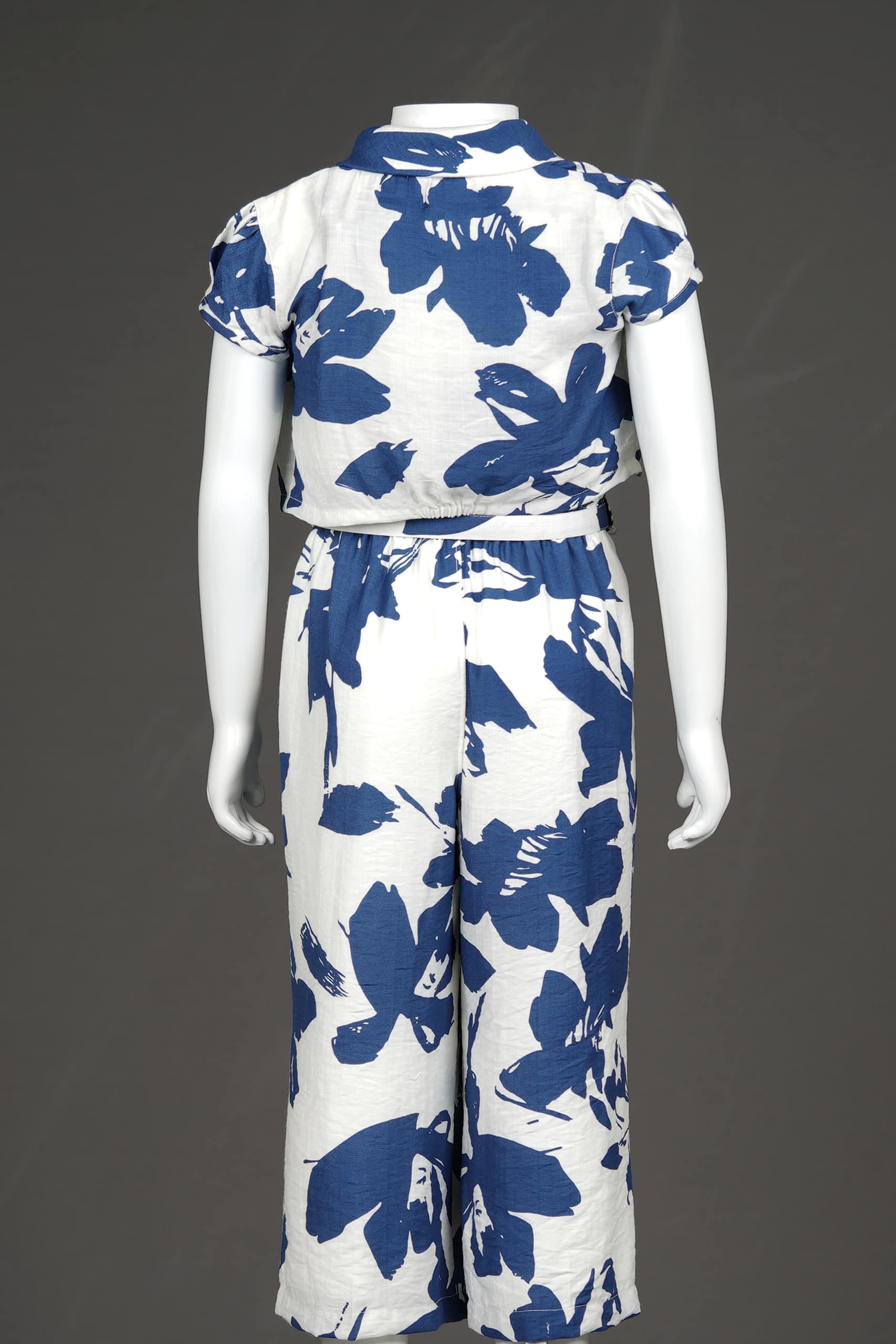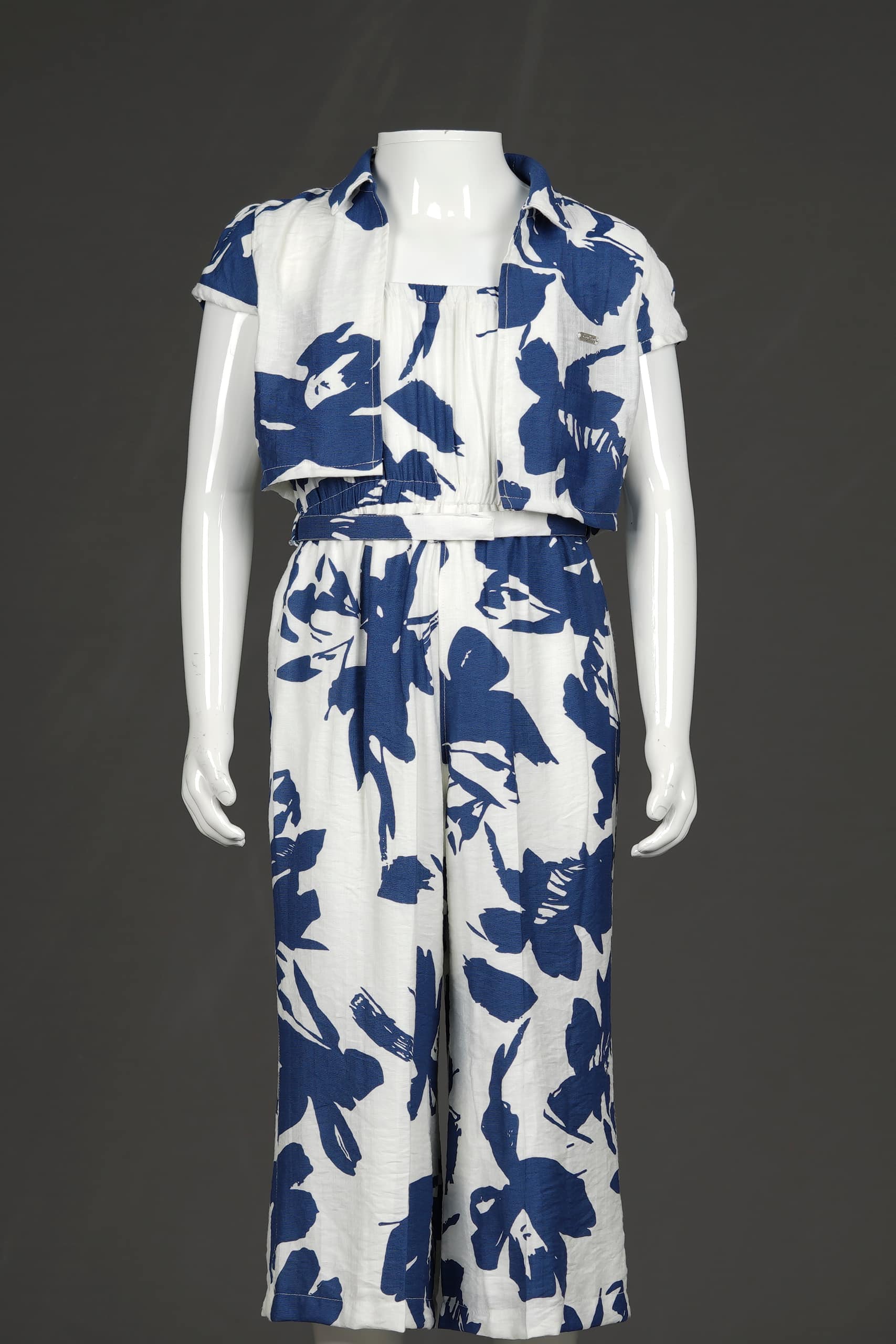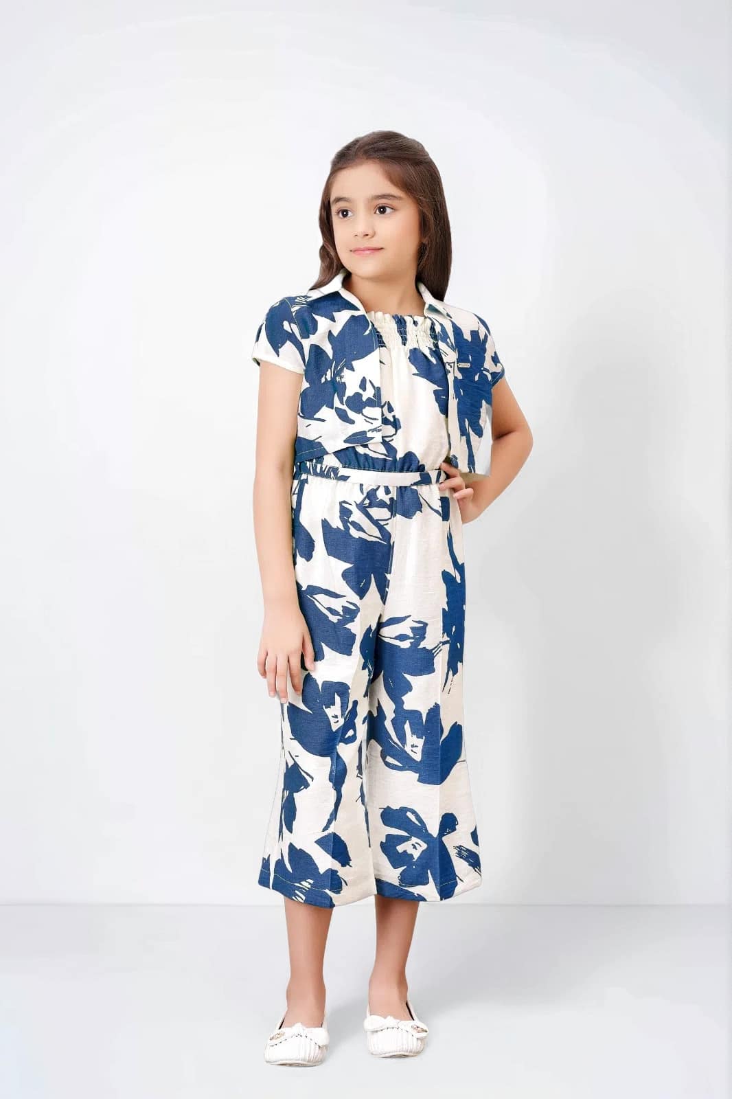 Stylish, breezy, and oh-so-comfy — this floral printed jumpsuit by Tiny Baby is a head-turner for your little fashion icon. Crafted with a soft, lightweight fabric, the ivory-white base adorned with bold navy-blue floral prints exudes effortless elegance. The sleeveless jumpsuit comes paired with a matching short-sleeve shrug, giving it a smart, layered look perfect for casual outings, family gatherings, or daytime events.
