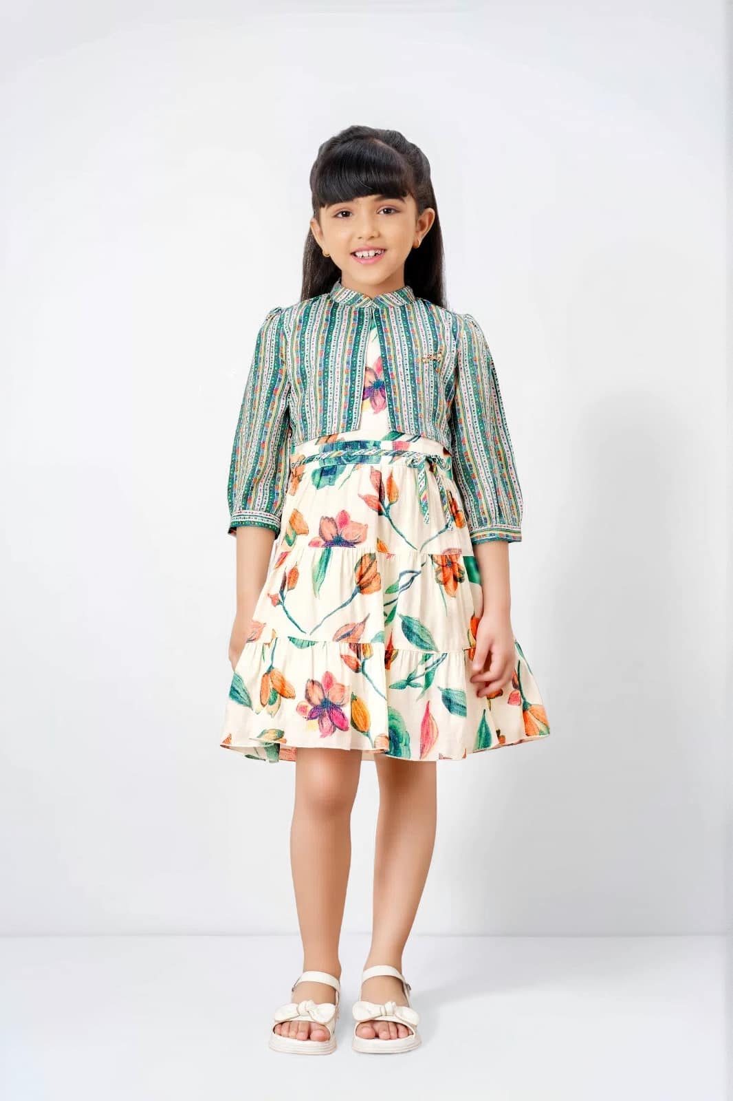 Add a touch of charm and color to your little one’s wardrobe with this vibrant floral dress from Tiny Baby. Featuring a sleeveless cream base dress with a lovely multicolor floral print and a stylish tiered design, it comes paired with a smart, striped cropped jacket that adds a contemporary edge. Ideal for casual to semi-formal occasions, this outfit is a great choice for parties, outings, and family celebrations.