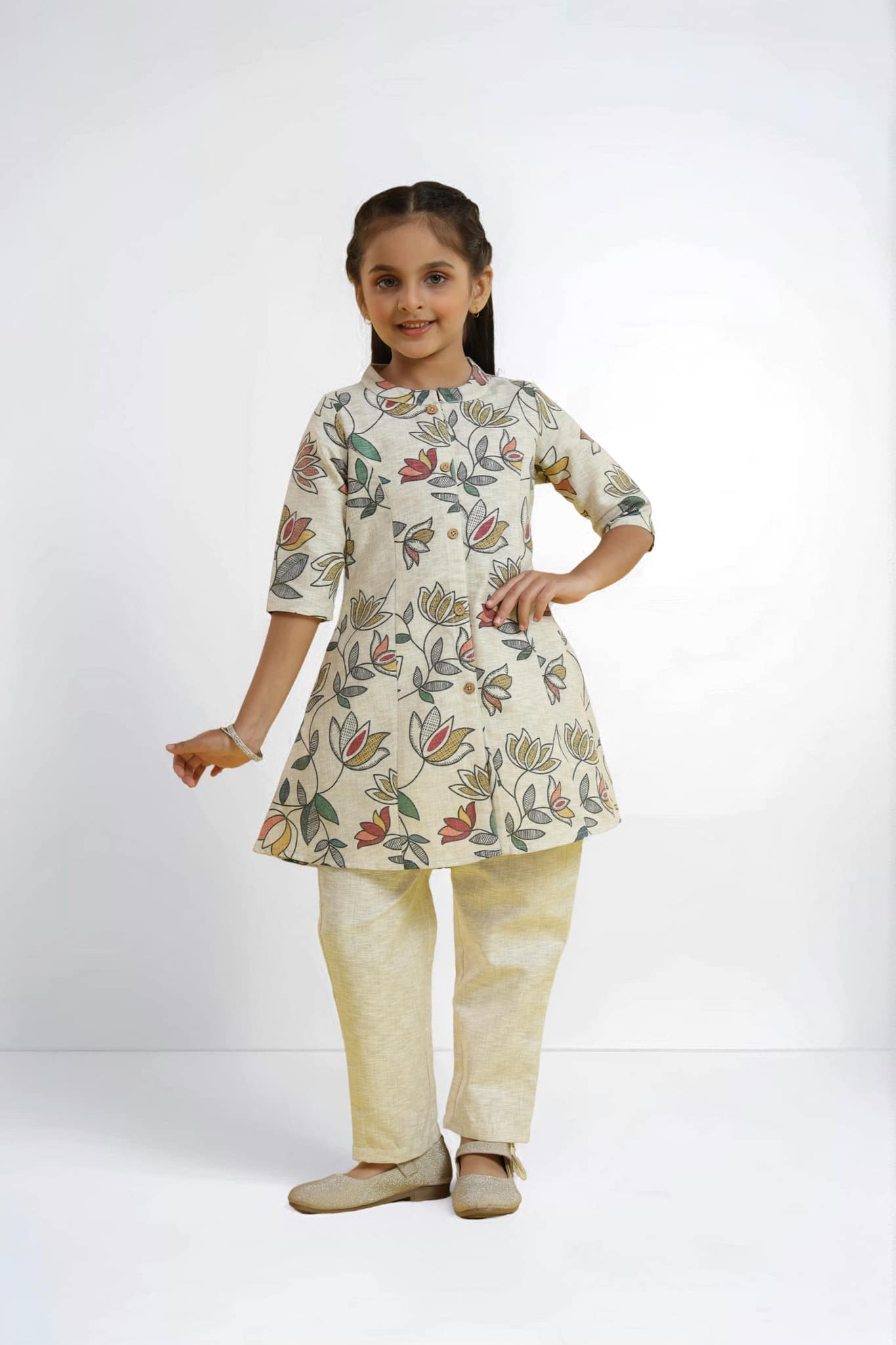 A charming blend of tradition and comfort, this beige floral kurti set is designed for everyday elegance. The kurti features an all-over multicolor floral print with a front button placket and is paired with solid beige pants. Perfect for casual outings, school events, or family get-togethers.